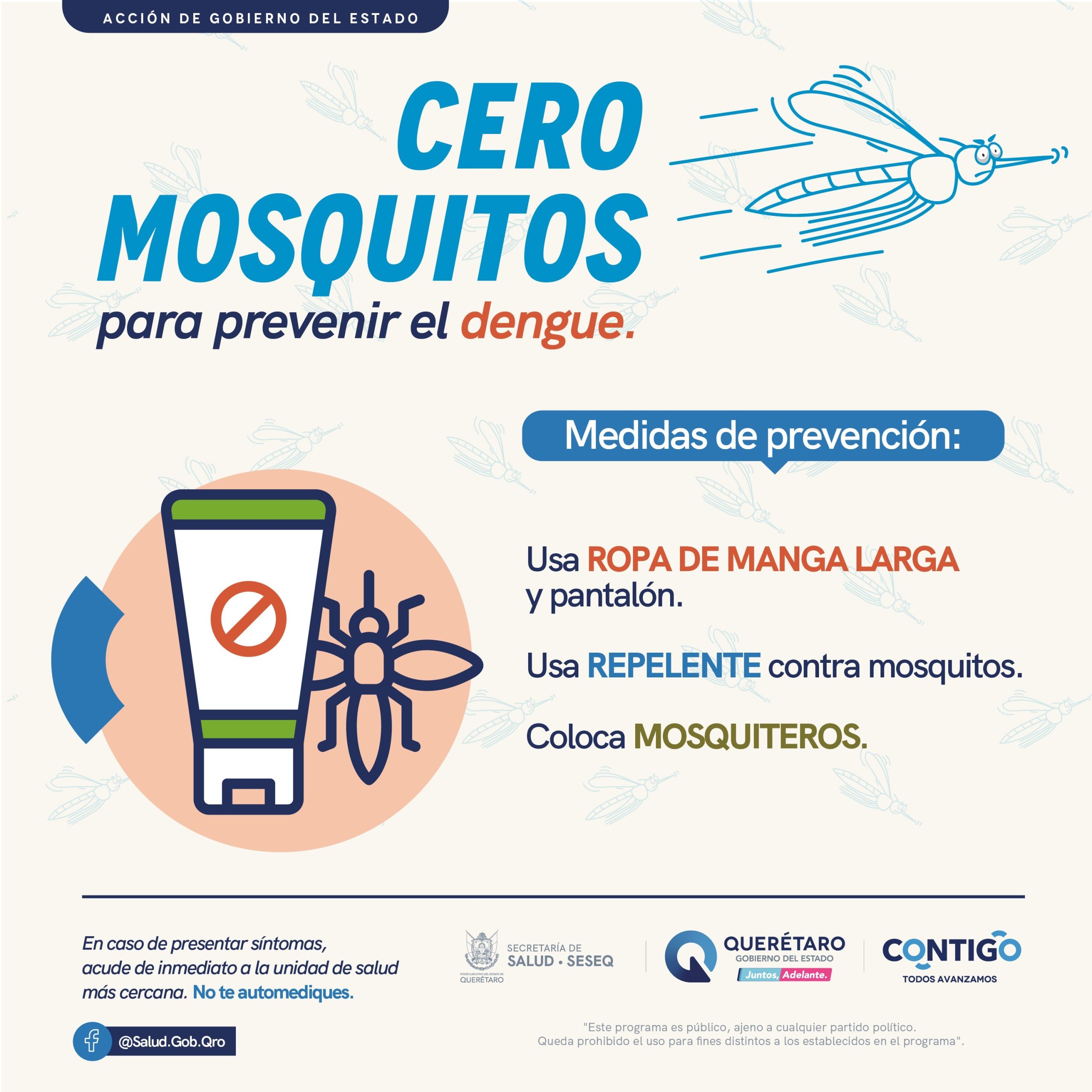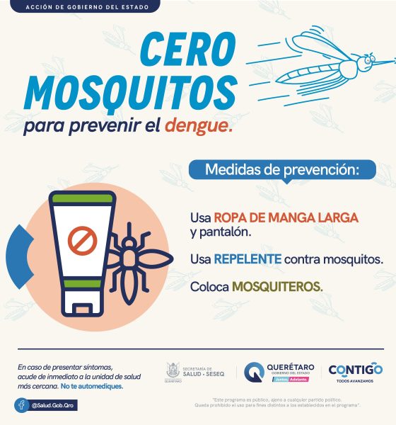 La Secretaría de Salud (SESA) del estado de Querétaro, exhorta a la población a adoptar y reforzar las medidas preventivas ante el incremento en el número de casos de dengue en México. Es fundamental eliminar todo tipo de criaderos de mosquitos, protegerse de las picaduras y solicitar atención médica oportuna en caso de presentar síntomas.
